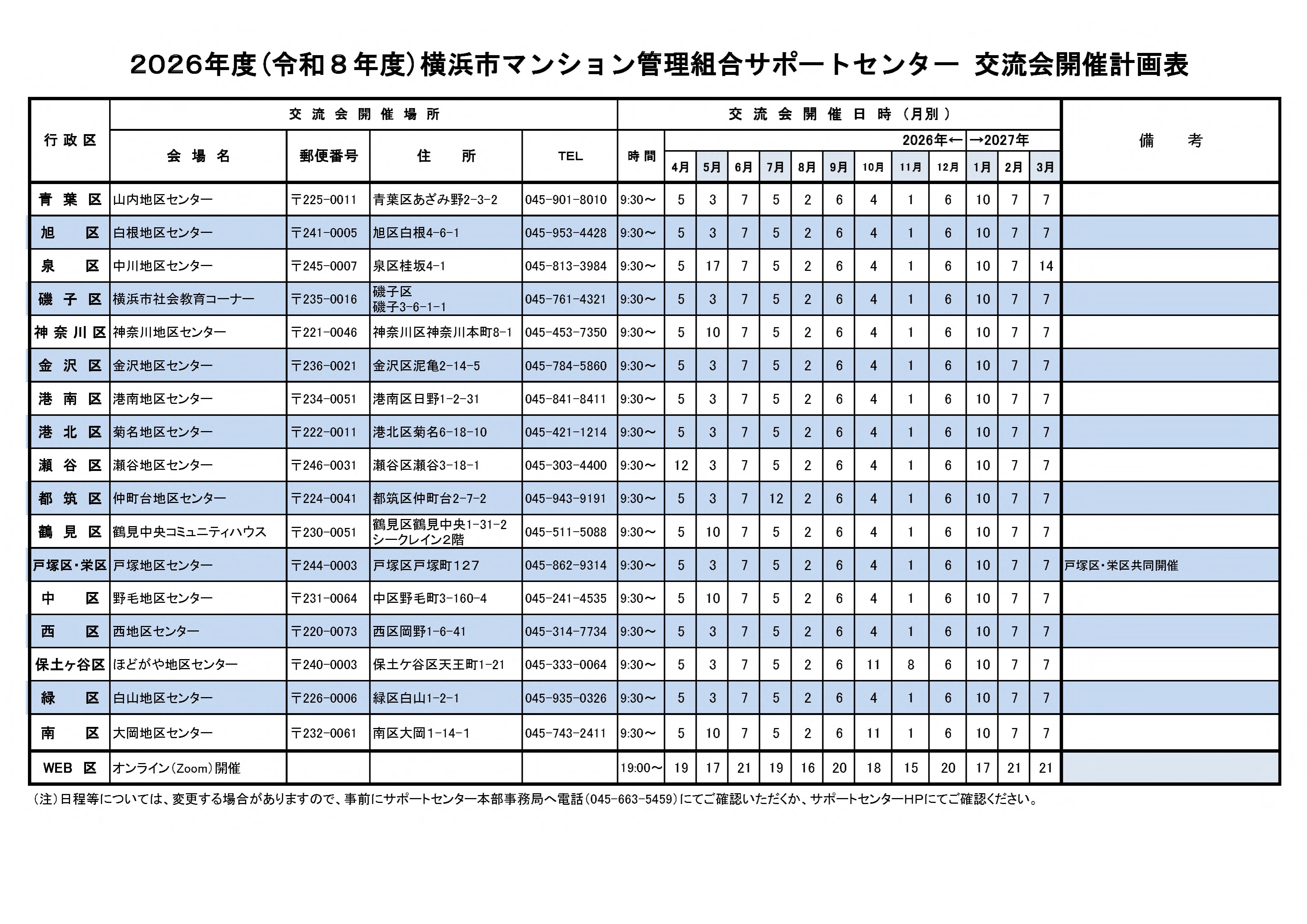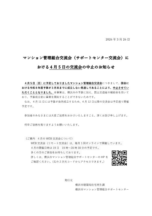 マンション管理の主体は区分所有者の皆様が作った管理組合にあります。横浜市はマンション管理の専門家4団体と協力し、市内18区にマンション管理組合サポートセンターを開設しており、毎月 第1日曜日 午前9時30分〜11時30分 どなたでも参加でき無料です。令和5年度も開催します。